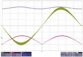圖3中,綠色曲線的較厚區域代表電流紋波,PFCIC在峰值輸入電壓下消耗電流較多,過零時沒有電流。粉色曲線代表整流器輸入電壓,藍色曲線為輸出電壓。