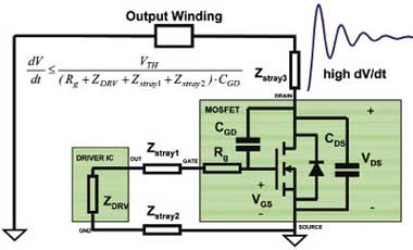 圖7解釋了讓柵極驅動器靠近功率MOSFET為什么如此有用。柵極驅動器的非零輸出阻抗ZDRV必須通過寄生阻抗Zstray1和Zstray2,以及柵極阻抗Rg來控制MOSFET,尤其是關斷。這時,漏極上的高dV/dt加上柵極路徑上的高阻抗,可能引起MOSFET的寄生導通。而利用極短的連線和功能強大的柵極驅動器,幾乎可以實現完美的開關。
