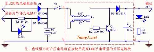 太陽能供電板的電路如圖1所示。由D1、BT構成系統的太陽能充電電路。平時,只要達到一定光強,太陽能電池板便通過二極管D1為充電電池BT充電,直至飽和。除了太陽能充電方式外,我還設計了備用的外部直流電源充電接口以防不時之需。外部充電電路由R1、DS1、D2、BT構成,R1選用功率為1W的電阻,當R1為10歐姆的時候,最佳外部充電電壓為3-4伏,DS1為外部充電指示燈,它是利用電阻R1上的壓降來點亮的。后面的升壓電路是運用間歇振蕩器的快速關斷(截止)的特性而實現升壓的。S1為供電開關,當S1閉合后升壓電路開始工作,太陽能供電板便可驅動負載,J1為輸出接口,DS2是輸出指示燈。