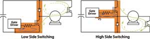 目前,大功率半導體器件(如IGBT和MOSFET)的發展趨勢是在提升性能的前提下不斷縮小芯片尺寸。減小芯片尺寸能減少器件的寄生電容,從而提高開關速率。因此,深入研究電路板上的關鍵回路越來越重要。圖1為電壓源變頻器(voltagesourceinverter,VSI)的兩種典型開關工作方式的簡化示意電路。在開關頻率受限的大電流應用中,IGBT是最受歡迎的器件。上圖所示為從高壓側(HS)續流二極管到低壓側IGBT的換流。電流最初是在高壓側二極管和相應反相半橋的IGBT形成的續流通道中。