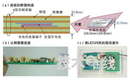 沖Printed Circuits在厚度為0.8mm的4層印刷底板上內置了IPS開發的厚0.17mm的全固態鋰離子充電電池(a,b)。
