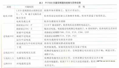 (5)上述調(diào)試試驗如有異常,立即查找原因并排除故障PI7000矢量變頻器的故障與異常處理,可見表2