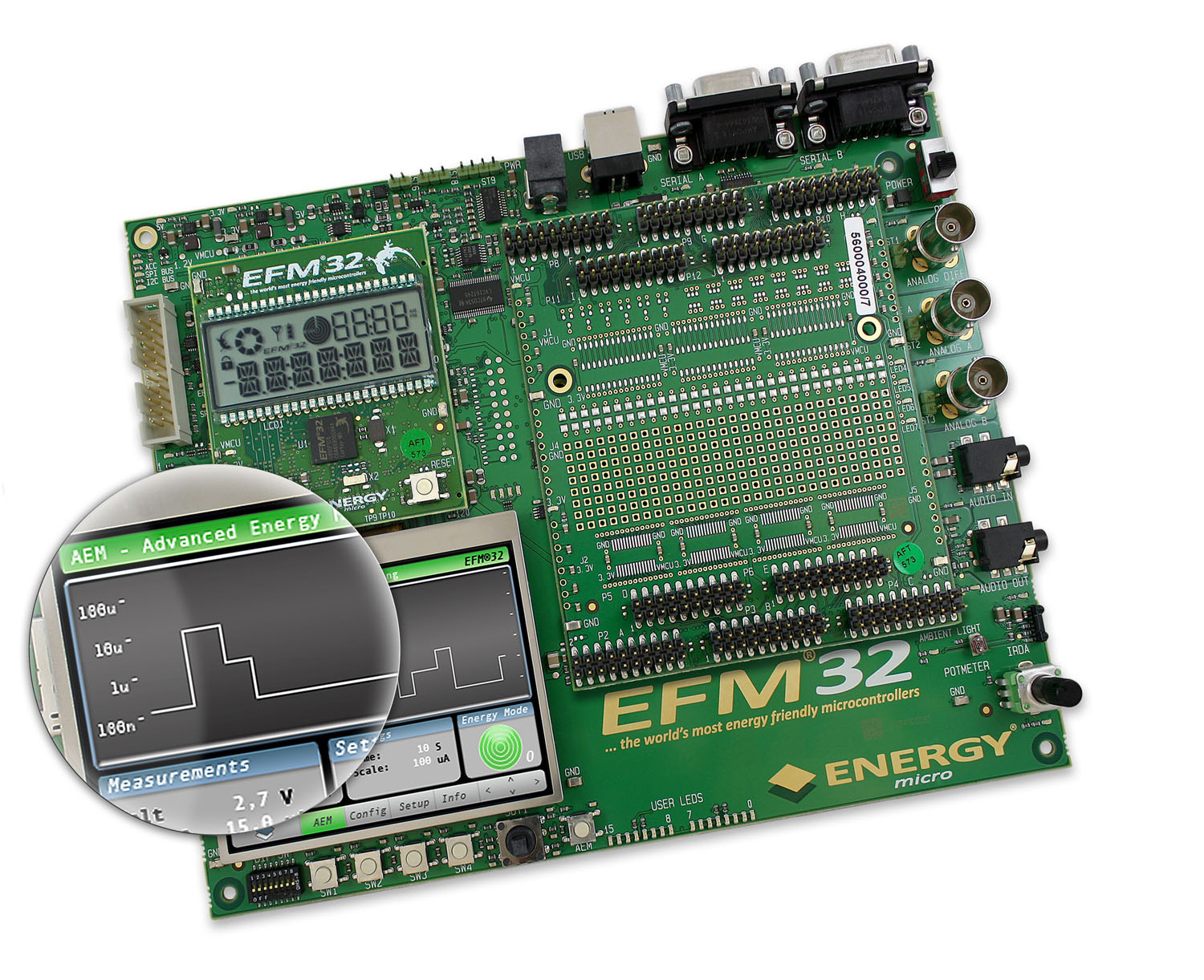 為了使開發者能夠最好使用最佳睡眠狀態,EFM32的開發工具包采用一個先進的能源監控系統來完成,這一設施使用一個從模擬到數字的轉換器來測量系列晶體管的下降電壓, 從而不斷測量電源軌上的電流。這種測量方法被綜合起來運用,準確地描繪用了一段時間的電源,使實際使用例子的低功率運行得到了優化。