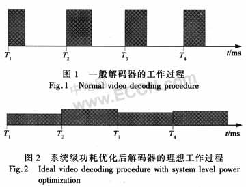 式中:T為工作時間;C是與系統負載電容相關的系數;Vdd和f分別為供電電壓和運行頻率。對于同樣的負載,根據式(1),很容易推導出,當負載均勻分布于時間間隔T內時,能量效率是最優的。所以,對于面向多媒體應用的SOC低功耗系統級優化而言,其主要思想就是如何根據具體應用的需要,在當前可用的IP及其配置中,尋求一套最優化的組合,使得系統負載能均勻分布在給定的時間約束內。圖2給出的則是設計者進行系統級功耗優化的理想狀態,雖然在實際應用中該狀態永遠無法達到,但是可以在設計過程中無限逼近這一狀態。