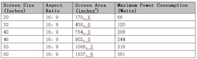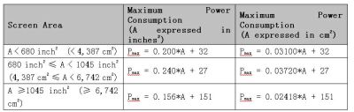 表2:根據ENERGYSTARV3.0標準計算各尺寸LCDTV最大允許功耗。