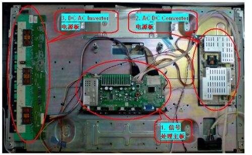 圖2:傳統式LCDTV內置信號處理、AC/DC電源、DC/AC電源三塊PCB板。