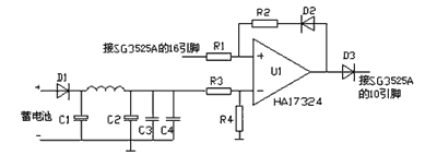 如圖5所示,D1為蓄電池極性反接保護(hù)。SG3525A的引腳16輸出參考電壓5V,取R3=R4=10kΩ。在正常情況下,U1的反相輸入端電壓大于正向輸入端電壓,U1輸出低電平,二極管D1、D2截止。當(dāng)蓄電池電壓低于10V時(shí),比較器U1開(kāi)始工作,輸出由低電平變?yōu)楦唠娖剑珼2、D3導(dǎo)通,并把同相輸入端電位提升為高電平,使得U1一直穩(wěn)定輸出高電平,向SG3525A的引腳10輸出關(guān)斷信號(hào)。