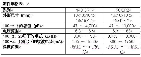 - 150 CRZ電容器具有低至0.035Ω的“Z”阻抗和高達1756mA的紋波電流