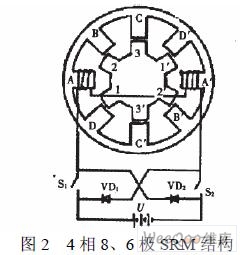 另外,當主開關器件S2導通時,A相繞組從直流電源U吸收電能,而當S1、S2關斷,繞組電流經續流二極管VD1、VD2繼續流通,并回饋給電源U。此,SR電動機傳動的共性特點是具有再生作用,系統效率高。