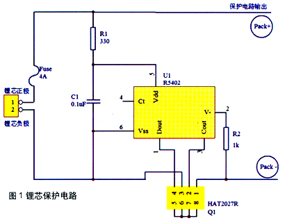 如圖1所示,電芯保護(hù)電路主要由R5402和HAT2027共同組成。除此之外,自恢復(fù)保險(xiǎn)絲起到了最后一層保護(hù)的作用。