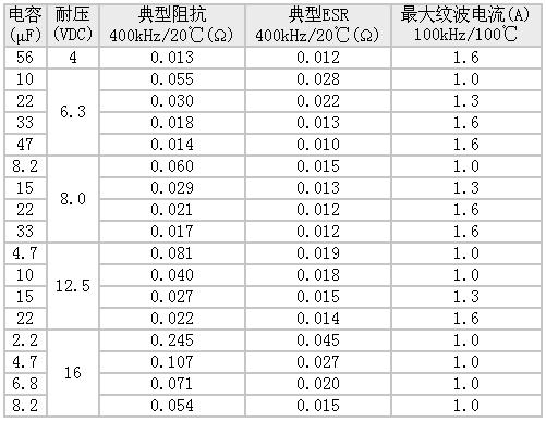 ESRD及ESRE兩個系列的電解電容具有極好的高頻特性,允許大的紋波電流,電容量允差±20%(精度為M級),等效串聯電阻ESR小,ESRD電容在100kHz時為10~45mΩ,ESRE電容在100kHz時低于10mΩ,400kHz、20℃時的阻抗為13mΩ到81mΩ,在使用溫度范圍內阻抗幾乎不變,工作壽命長,小尺寸貼片式封裝,ESRD的尺寸為7.3mm(長)×4.3mm(寬)×1.8mm(高),而ESER系列的尺寸僅高度尺寸不同,高度為4.2mm,工作溫度為-55℃~+105℃。