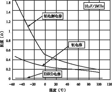 圖4是三種不同的10μF電容器在溫度變化時的阻抗變化情況,可以從圖4中看出鋁電解電容器在負溫時阻抗變化較大,鉭電容性能較好,而ESRD電容在-55℃~+105℃的溫度范圍內阻抗幾乎不變,而且三種電容中ESRD型電容器的阻抗最小。
