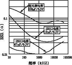 圖5是在不同頻率下100μF的鉭電容、10μF及47μF的ESRD電容的ESR值的變化情況。由圖可以看出,在1MHz時,10μF的ESRD電容的ESR值約為0.012Ω,而100μF的鉭電容在1MHz時約為0.016Ω,二者的容量差10倍,這說明ESRD電容具有良好的高頻性能。