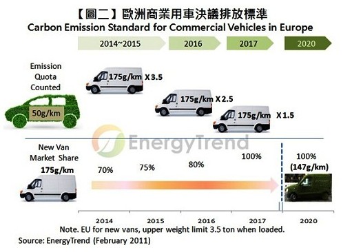 歐洲國會發布最新的商用車車輛排放標準決議,針對在載重能力為3.5噸的車輛,未來車廠所生產的車輛中,70%的數量須符合175g/km的排放標準,而2017年平均比例更須達到100%。無法達到要求的汽車制造商,2019年開始將被要求繳交每單位金額$129/g的增額排放罰款。另外,生產排放低于50g/km的車輛,也將能夠回饋車廠在高排放車種的緩沖額度。
