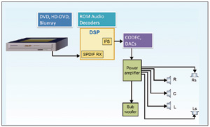 利用多聲道、多揚聲器系統和先進的音頻算法,音頻系統能夠惟妙惟肖地模擬真實聲音。這些復雜的音頻系統使用ASIC或DSP來解碼多聲道編碼音頻,并且運行各種后處理算法。聲道數量越多,意味著存儲器和帶寬要求越高,這就需要使用音頻數據壓縮技術來編碼并減少所要存儲的數據。這些技術還能用來保持聲音質量。