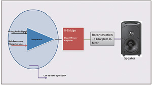 圖7為一個D類放大器系統。有時將這種放大器稱為數字放大器,但事實并非如此。其工作原理仍然與其他類型放大器相同,但D類放大器的輸入信號為PWM(脈沖寬度調制)信號。由于數字輸入在邏輯高電平和邏輯低電平之間來回切換,因此晶體管工作在飽和區間或截止區間,但決不會工作在有效區間,因此功耗始終最低。這使得功率效率大幅提高,但同時也會引起較高的總諧波失真(THD)。