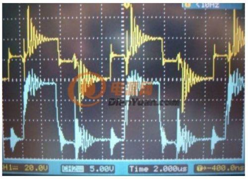 在談驅(qū)動問題前,先上一幅實(shí)測的推挽逆變電路的其中一邊MOS管的G極波形(1:1藍(lán))與升壓變壓器的副邊電壓波(15:1黃),這是電路處在滿載1000WDC+24V輸入時(shí)的實(shí)測波形,可以看到另一路MOS管導(dǎo)通時(shí)串入到截止MOS管的G極的干擾尖刺波形。