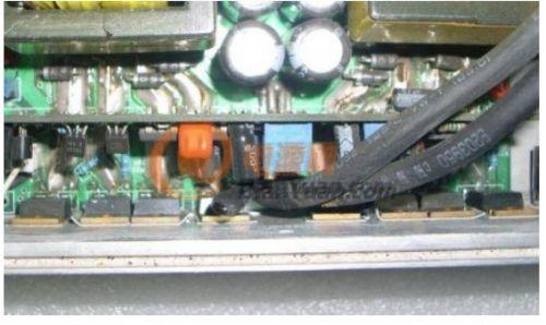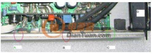 攝氏25度環(huán)境時(shí),輸出滿載1000W,10分鐘后圖片B處(8個(gè)MOS管的中心位置)的溫度比A處高出6~8度!C處(綠圈)最低,比B處低14~15度?。–處為進(jìn)風(fēng)口,D為風(fēng)扇,樣機(jī)為進(jìn)風(fēng)設(shè)計(jì),據(jù)說是用以延長含油軸承的壽命),同樣型號并聯(lián)工作的功率MOS管,實(shí)際工作的溫差那么大,自然對“均流”是極其不利!所以可靠性不高就不足為怪了。