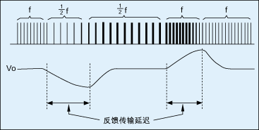 當負載降低到一定程度時,脈沖跳躍機制將使有效開關頻率減半,這意味著轉換器供應負載的功率減半,因此回掃電路將增加脈沖寬度以補足輸出負載所需要的功率,而在脈沖寬度增加到負載所需功率之前,輸出電壓將產生突降。相反的情形發生在等效開關頻率增加時,輸出電壓將發生突升。這種負載變動時輸出電壓突升與突降是開關頻率非連續變動(以整數倍增加或降低)的必然結果。
