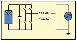 無變壓器的DC/AC逆變器在歐洲廣泛應用,但是在美國,這種產品只是最近才在某些地區被使用。無變壓器的逆變器拓撲結構有很多種,而Fraunhofer研究所開發的HERIC拓撲表現出了很高的效率。傳統的全橋逆變器的結構如圖1所示,HERIC拓撲如圖2所示,此圖中還顯示了兩種新的開關/二極管對。這種拓撲利用獨有的續流路徑來減小開關和導通損耗,使效率提升到98%以上。
