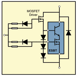 當一個ESBT同外置MOSFET和二極管/電阻配對的時候,整個電路看起來像一個3端器件,經驅動后能達類似IGBT或功率MOSFET的工作狀態。ESBT的關斷能量比IGBT低很多,能實現高效設計,并非常適合高頻率、高壓逆變器設計。