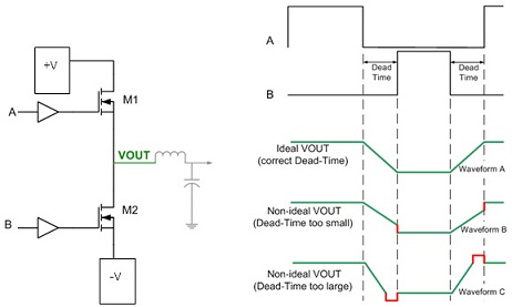 D類放大器死區時間(即兩個開關均處于關閉狀態時的時間段)直接影響到效率和THD。過于短暫的死區時間會引起直通電流,降低效率,過長的死區時間又會增大THD,這會給音頻保真度帶來不利影響。