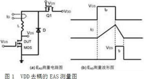 過去,傳統的測量EAS的電路圖和波形如圖2所示。注意到,VDS最后的電壓沒有降到0,而是VDD,也就是有部分的能量沒有轉換到雪崩能量中。