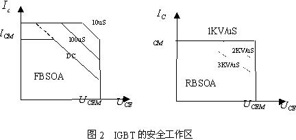 在IGBT開關過程中,大電流和大電壓的重疊造成主要的功耗,同時承受較高的di/dt和dv/dt即電流電壓應力。特別是運行在PWM硬開關狀態下,這是影響可靠性的重要原因。為了保證其安全可靠的工作,不僅有電流電壓的限制,還必需使其動態過程的運行軌跡在安全工作區內。如圖2所示,正偏安全工作區FBSOA是指柵極加正向電壓時的安全工作區,對應于導通狀態。三條邊界分別對應允許電流、允許電壓和允許功耗。隨著導通時間增長,功耗和溫升增加,安全工作區縮小。