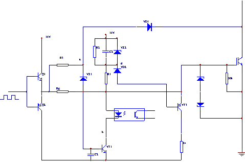正常工作時,因故障檢測二極管VD1的導通,將a點的電壓鉗位在穩壓二極管VZ1的擊穿電壓以下,晶體管VT1始終保持截止狀態。當電路發生過流或短路故障時,V1上的uce上升,a電壓隨之上升,到一定值時,VZ1擊穿,VT1通,b點電壓下降,電容C1通過電阻R1充電,電容電壓從零開始上升,當電容電壓上升約1.4V時,晶體管VT2開通,柵極電壓uge隨電容電壓的上升而下降,通過調節C1的數值,可控制電容的充電速度,進而控制uge的下降速度;當電容電壓上升到穩壓二極管VZ2的擊穿電壓時,VZ2擊穿,uge被鉗位在一固定的數值上,慢降柵壓過程結束,同時驅動電路通過光耦輸出過流信號傳送至單片機,此時單片機發出聲光報警并開始運行延時程序。如果在單片機的延時過程中,故障信號消失了,則a點電壓降低, VT1恢復載止,C1通過R2放電,d點電壓升高,VT2也恢復截止,uge上升,電路恢復正常工作狀態,單片機自動進行復位。如果單片機在延時結束后,故障信號仍存在則由單片機切斷所有IGBT的輸入脈沖,設備停止工作,此時要通過手動復位才能恢復正常工作。這種電路既能保護逆變電路和IGBT的安全,又不會在瞬時過流時中斷逆變電源工作所以是一種非常有效的保護方式。