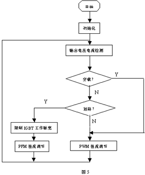 在此硬件電路的基礎上,結合單片機的控制系統可檢測輸出電壓低于某一設定值時,單片機便認為負載電弧是處于短路狀態,這時單片機便對IGBT的最小脈沖寬度進行限制,以保證吸收電容有足夠的放電時間,從而降低IGBT的關斷反向電壓。同時為保證輸出電流恒定,單片機在判斷輸出為短路時將逆變器的等脈沖寬度調節(PWM)變為頻率調節控制(PFM),即脈沖分頻控制,輸出電壓越低,輸出脈沖的頻率越低。其單片機程序過程如圖5所示: