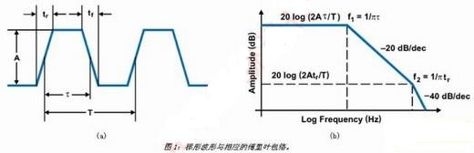 對于CCM中運作的降壓轉(zhuǎn)換器,電感電流一直是非零的正電流。在這種情況下,負載周期為D=Vout/Vin,在本例中為38%(5V/14V)。使用200kHz的開關(guān)頻率時,我們很快計算出導通時間為1.8μs。為支持此頻率,控制開關(guān)的上升/下降時間必須小于90納秒。這使得我們注意到第一個減少噪聲的方法,也就是斜率控制。您可能還無法理解,但是此時我們非常了解與PWM切換節(jié)點有關(guān)的諧波,也就是開關(guān)穩(wěn)壓器的控制波形。如果將此波形以圖1(a)中所示的梯形表示,波形的諧波便能夠以圖1(b)中的內(nèi)容表示,這表明了EMI背后的驅(qū)動因素。這一傅里葉包絡(luò)定義了可通過傅里葉分析或計算梯形波形導通時間及上升時間取得的諧波振幅。