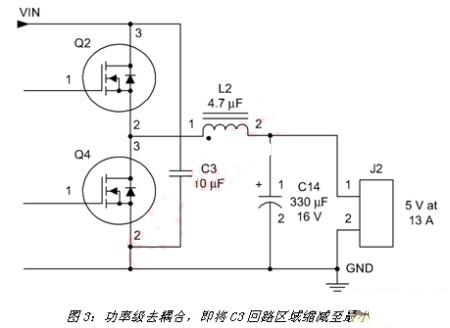 在一個電源的正確配置中,必須將大電流導體的回路部分縮減至最小。這樣做能夠?qū)⒆鳛樘炀€源和發(fā)射能量的電感降至最低。其中一個層面是有效放置元件及選用去耦電容。圖3顯示同步降壓轉(zhuǎn)換器的輸出功率級與濾波器。C3將功率級去耦合,以便在Q2啟動時提供低阻抗源。為了將輻射發(fā)射量降至最低,必須如圖所示連接C3,其中電容的固有阻抗、電路信號線及通過電感的互連均縮減至最小。另外,也需要具有諸如X7R等高自振頻率的高品質(zhì)電容電介質(zhì)。