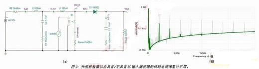 只要加入L2及C2,波形便會變成正弦曲線,而能量會重新調(diào)整為相當?shù)偷母哳l率峰值。不過,如果不能正確設(shè)計輸入濾波器,則會將噪聲放大而使得控制回路不穩(wěn)定。因此,了解濾波器設(shè)計的概念,對于優(yōu)化濾波器回波及成本相當重要。使用SPICE的AC分析是有效了解濾波器行為的工具。