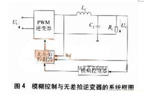 將輸出電壓和濾波電感電流反饋,即電壓誤差和電感電流作為輸入模糊變量,可以實現逆變器的模糊控制,整流性負載時,其輸出電壓總諧波失真(total harmonic distortion,TH)小于5%,將模糊控制與無差拍控制相結合,可用來補償由于非線性負載導致的電壓降落,其系統如圖4所示。模糊控制從模仿人的思維外特性入手,模仿人的模糊信息處理能力。它對系統的控制是以人的經驗為依據的,而人的經驗正是反映人在思維過程中的判斷、推理、歸納。理論上已經證明,模糊控制可以任意精度逼近任何線性函數,但受到當前技術水平的限制,模糊變量的分檔和模糊規則都受到一定的限制,隸屬函數的確定還沒有統一的理論指導,帶有一定的人為因素,因此,模糊控制的精度有待于進一步提高。
