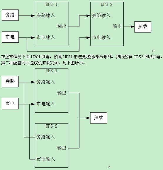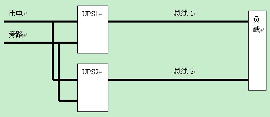 對于一般的UPS系統應用來說,存在兩種常見的配置方式,一種是雙機熱備份,見下圖所示