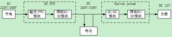 在UPS應用的另外一個分支是目前正在興起的直流UPS系統。直流系統的思路是出于提高效率的目的,減少電源系統中間的轉換環節,電力分配部分由原來的交流轉換成直流。一個理想的直流UPS系統服務器應用從市電到12V終端的應用結構見下圖。
