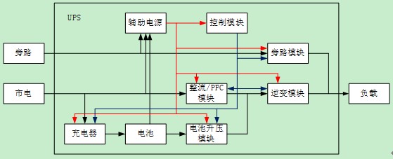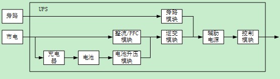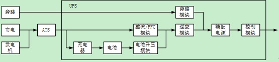 從單個UPS的設計來說,可以把整個產品按照模塊進行劃分,下面圖中是一個典型的UPS系統結構圖