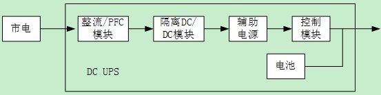 在這種直流UPS體系里面,不存在交流UPS中的旁路回路了,只存在一個市電到電池回路,這個回路也兼有充電器的作用。因此從單個UPS的可用靠性角度考慮,直流UPS可靠性鏈路只有兩條,其中一條是兩級變換加上輔助電源與控制板,另外一條是電池,見下圖所示