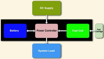 上述系統(tǒng)在使用的不同階段,能夠用做三種能源和兩種負(fù)載。當(dāng)該系統(tǒng)沒有插接直流電源時,燃料電池和/或蓄電池的組合結(jié)構(gòu)能夠為系統(tǒng)負(fù)載供電。另外,當(dāng)直流電源不存在時,燃料電池還能夠?qū)π铍姵剡M(jìn)行充電,以盡可能地增強(qiáng)電源斷電末期(end-of-power-shutdown)的性能,或者實現(xiàn)更好的系統(tǒng)動態(tài)電源響應(yīng)特性。當(dāng)直流電源可用時,它既對蓄電池進(jìn)行充電也對系統(tǒng)負(fù)載進(jìn)行供電。