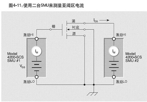 亞閾區電流測試常常在晶圓片級進行。它是表示器件打開和關閉的快慢程度的參數。圖4-11示出測量亞閾區電流的典型測試設置情況。在此配置中,4200型半導體特性分析系統配備了2個SMU和前置放大器。使用一個SMU來提供恒定的漏-源電壓(VDS),并測量產生的漏極電流(IDS)。另一個SMU用來掃描柵-源電壓(VGS)。對這個SMU來說,應當將鉗位電流或測量電流值設置為固定測量量程上的最高期望的柵極電流。