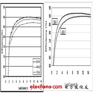 Maxim電源部制作了一款基于MAX5051的隔離電源模塊,圖2是詳細(xì)的電氣原理圖。我們將該電源模塊與市場(chǎng)上流行的電流模式同步整流推挽電源模塊(這里我們稱(chēng)其為非定制模塊)進(jìn)行了比較,從所測(cè)試的效率曲線(圖3)可以看出,基于MAX5051的模塊效率明顯提高。輕載時(shí),比如1A輸出負(fù)載,MAX5051模塊電源的效率大于62%,而非定制模塊的效率則小于58%。在輸出功率為半載時(shí)(7.5A),MAX5051模塊效率為92%,非定制模塊效率是88%。滿(mǎn)功率負(fù)載時(shí),MAX5051模塊電源的效率仍比非定制模塊效率高出4%。從效率曲線對(duì)比,可以得出雙管正激電路能夠更好的滿(mǎn)足模塊電源高效率的要求。