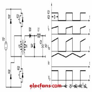 雙管正激變換器的原理圖與波形如圖1所示。雙管正激變換器的工作可以分為三個(gè)過(guò)程:能量轉(zhuǎn)移階段、變壓器磁復(fù)位階段和死區(qū)階段。在能量轉(zhuǎn)移階段,原邊的兩個(gè)開(kāi)關(guān)都導(dǎo)通,能量從輸入端向輸出端轉(zhuǎn)移。在變壓器磁復(fù)位階段,原邊的兩個(gè)二極管都導(dǎo)通,使變壓器繞組承受反相輸入電壓,從而實(shí)現(xiàn)變壓器磁復(fù)位。當(dāng)變壓器完全復(fù)位后,變換器工作在死區(qū)階段,即原邊無(wú)電流、副邊續(xù)流。在復(fù)位過(guò)程中,雙管正激開(kāi)關(guān)MOSFET被箝位在輸入電壓。MOSFET上的電壓應(yīng)力小于單管正激,至少低一倍。這樣我們可選取具有低導(dǎo)通電阻Rdson的低電壓MOSFET,以獲得低損耗。