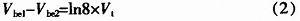 其中I是三極管射極電流,Is與射極面積成正比,n為一常數,取1。這里,取VQC2:VQC1=8:1,因此Is2=8xIs1,又I1=I2,分別代入(1)并相除,整理得:
