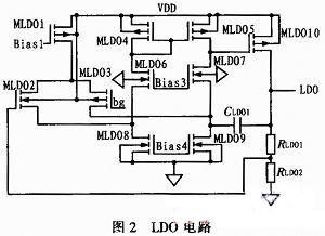 LDO在低頻時的PSR主要取決于運放的增益,為此選擇折疊共源共柵電路。此LDO電路基于文獻中的電路修改,如圖2所示,并采用PSR高的偏置生成電路。