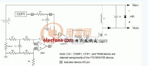 然后,應用程序代碼可以測量供電電壓(利用片上集成的10位A/D轉換器)和供電電流,從而保證驅動LED工作在恒定功率模式。隨著電池輸入電壓的變化,D/A電路(采用CCP外設實現)將產生新的參考電壓值進行補償。
