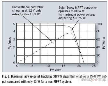 未采用MPPT算法的逆變器簡單地將光伏模塊與電池直接連接起來,迫使光伏模塊工作在電池電壓。幾乎無一例外的是,電池電壓不是采集最多可用太陽能的理想值。