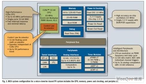 圖3  面向基于微逆變器PV的系統(tǒng)的MCU系統(tǒng)包含CPU、存儲器、電源及時鐘、外設(shè)