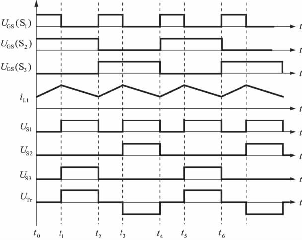 開關管S1、S2、S3的驅動信號,以及開關管所承受的電壓波形、電感L1中的電流波形,如圖2 所示。