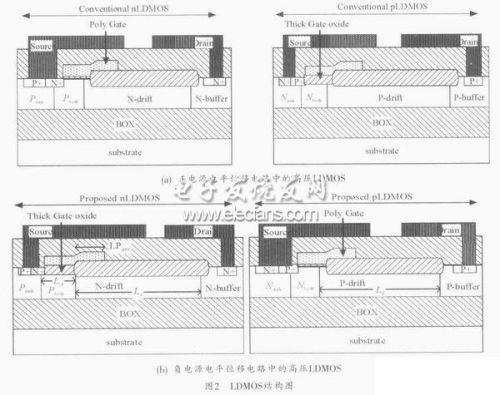 由于負電源供電的電平位移電路結構的改變,應用于正電源的常規nLDMOS和pLDMOS不能滿足該電路結構要求。在正電源供電的電平位移電路中,由于pLDMOS的源端接高壓電源,其柵源需要承受高壓,所以pLDMOS采用了厚柵氧的結構,如圖2(a)所示。在使用負電源的電平位移電路結構中(圖1(b)),pLDMOS的源端為邏輯高壓8V,柵端由低壓邏輯0~8V電壓控制,因此柵源不再承受高壓。但是nLDMOS的源端為負電源的最低電位,其柵源需要承受高壓,因此高壓nLDMOS需要采用厚柵氧結構,如圖2(b)所示。