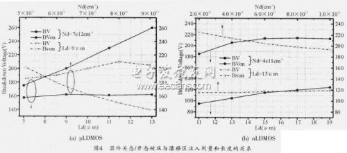 利用工藝器件聯合仿真,在傳統的正電源應用的LDMOS基礎上對器件的結構參數進行優化設計。圖4(a)為pLDMOS在漂移區注入劑量Nd=7 e12cm-2時關態耐壓、開態耐壓與漂移區長度Ld(μm)的關系,以及在漂移區長度Ld=9μm情況下關態耐壓、開態耐壓與漂移區注入劑量Nd(cm-2)的關系。其他參數為:n型體區注入劑量5e12 cm-2,Nsink注入劑量3e15 cm-2,P-buffer注入劑量1.5e13 cm-2,溝道長度3μm,柵極場板3μm。從仿真結果可以看出:pLDMOS的關態耐壓隨漂移區的增加而增大,隨漂移區的注入劑量的增大先增大后減小;開態耐壓隨著漂移區注入劑量的增大而降低,但是在一定范圍內漂移區長度對其影響較小。總體上,pLDMOS的關態耐壓、開態耐壓都在160V以上,完全能夠滿足8~-100V工作電壓(108V耐壓)的要求。